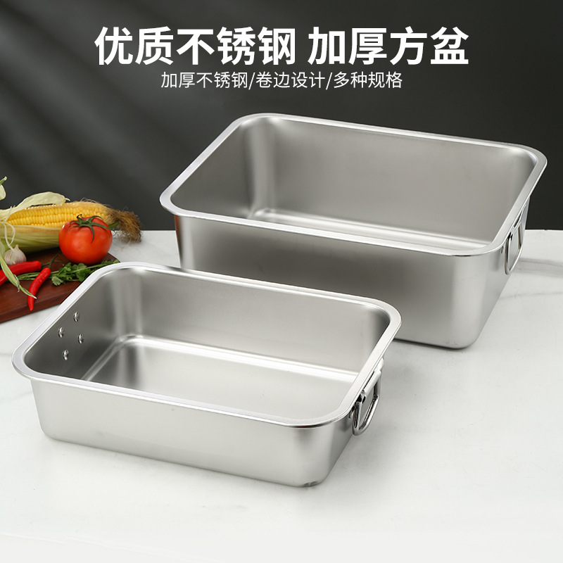 304 ステンレス鋼の正方形の洗面器、耳ハンドル付き長方形の正方形のプレート、食品ターンオーバー洗面器、業務用大型食事洗面器、野菜洗面器