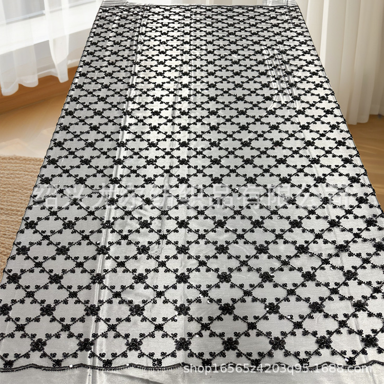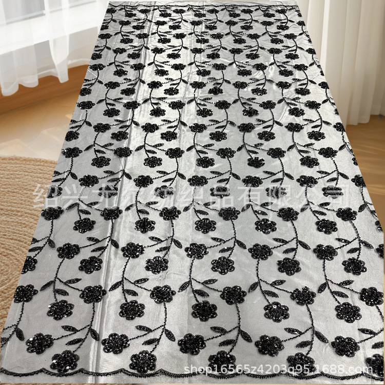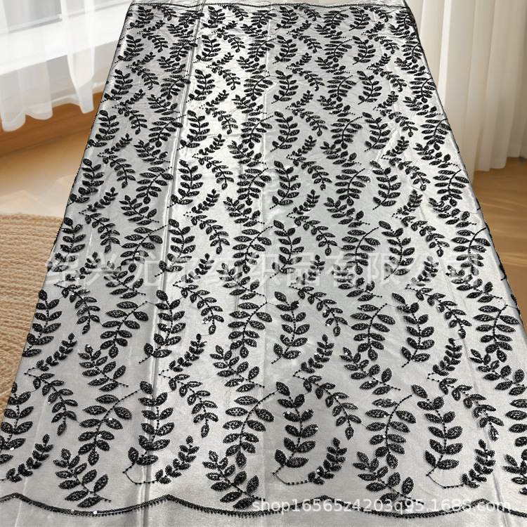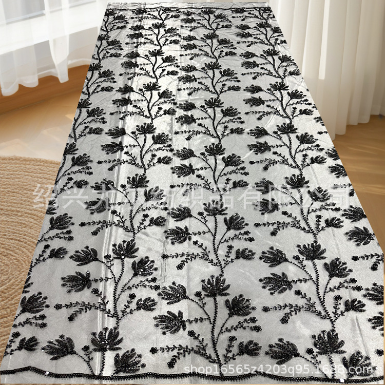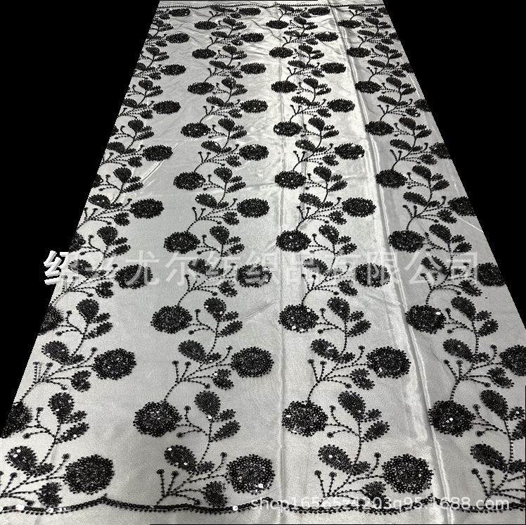 黒の全ポリエステル韓網単珠黒のスパンコール玉管刺繍満幅の麦穂女装服装刺繍生地対外貿易金
