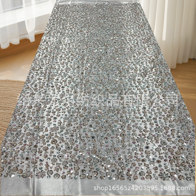2025新型開発金光幻彩珠片満幅の大きな花白銀米珠刺繍ファッション婦人服生地