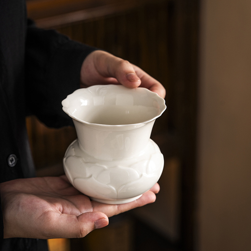 意参手作は宋定窯の彫刻をまねて、中国式のレトロな家庭用オフィス茶器の高足蓮の葉の花の口を作って水のお茶を建てて洗います。