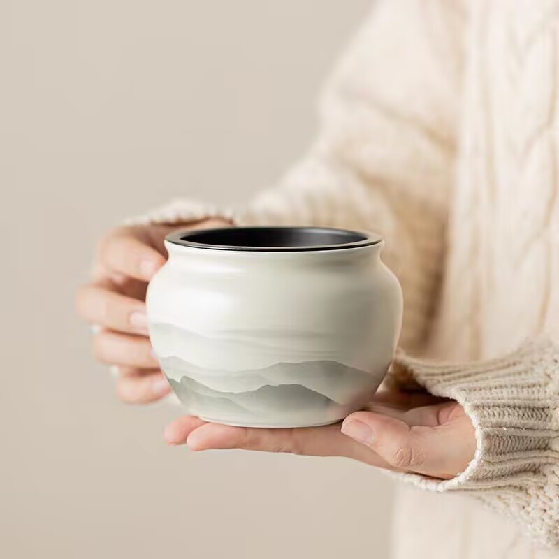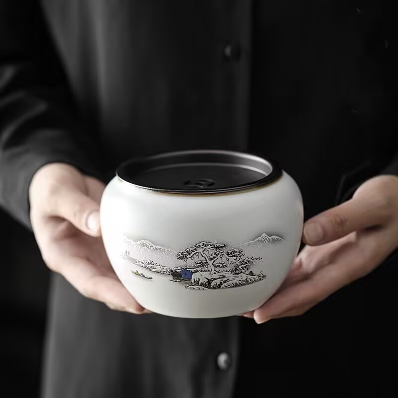 草木灰純手描き山水円口建水高級陶磁器茶洗茶かすかめ水盆廃バケツ茶具部品