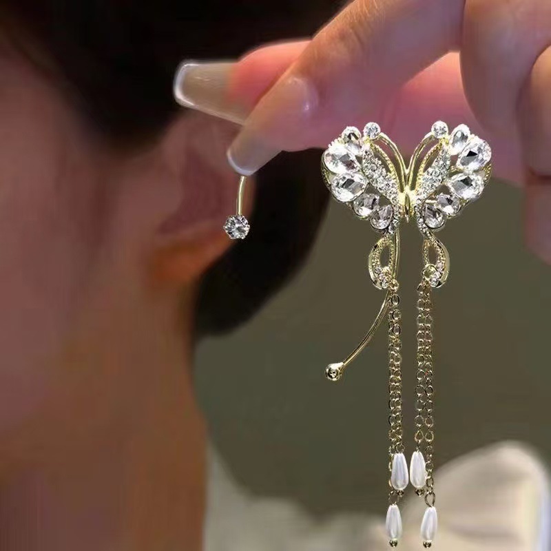 新型蝶超仙流蘇真珠水滴耳掛け無耳穴一体式高級感新中国式軽贅沢イヤリング