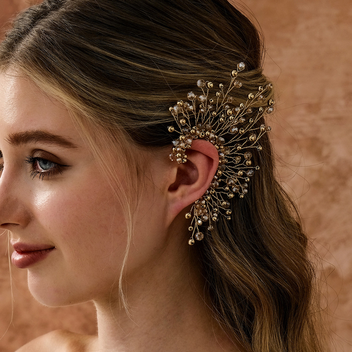 欧米の人気新婦の耳掛けの純粋な手作りの金色のccbの玉の耳の骨は森系の精霊の水晶の軽い贅沢な耳飾りを挟みます。