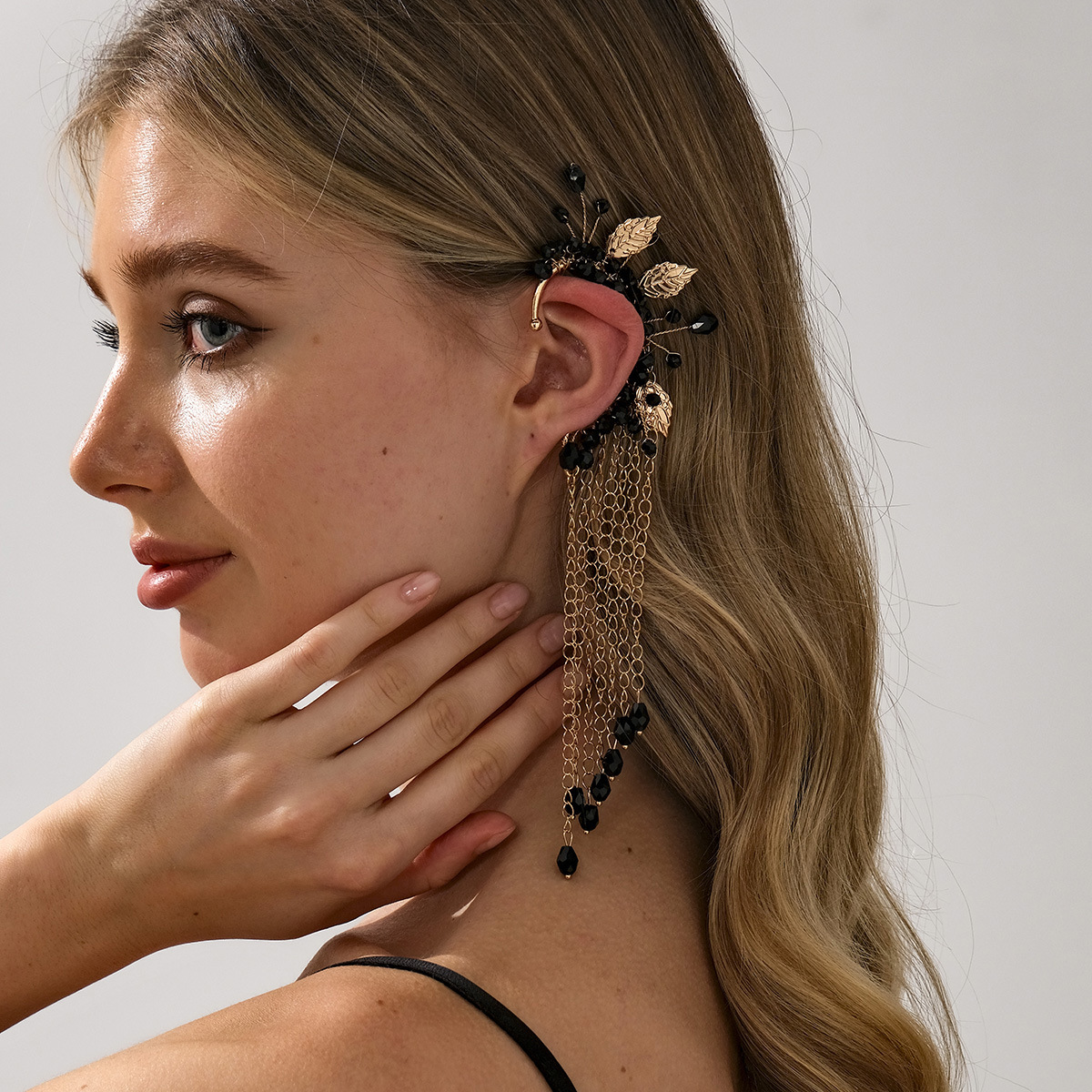 欧米の個性的な黒い水晶の玉の耳掛けの金色の葉の軽い豪華な耳の骨は復古のダンス会のパーティーのフリンジの耳飾りを挟みます。