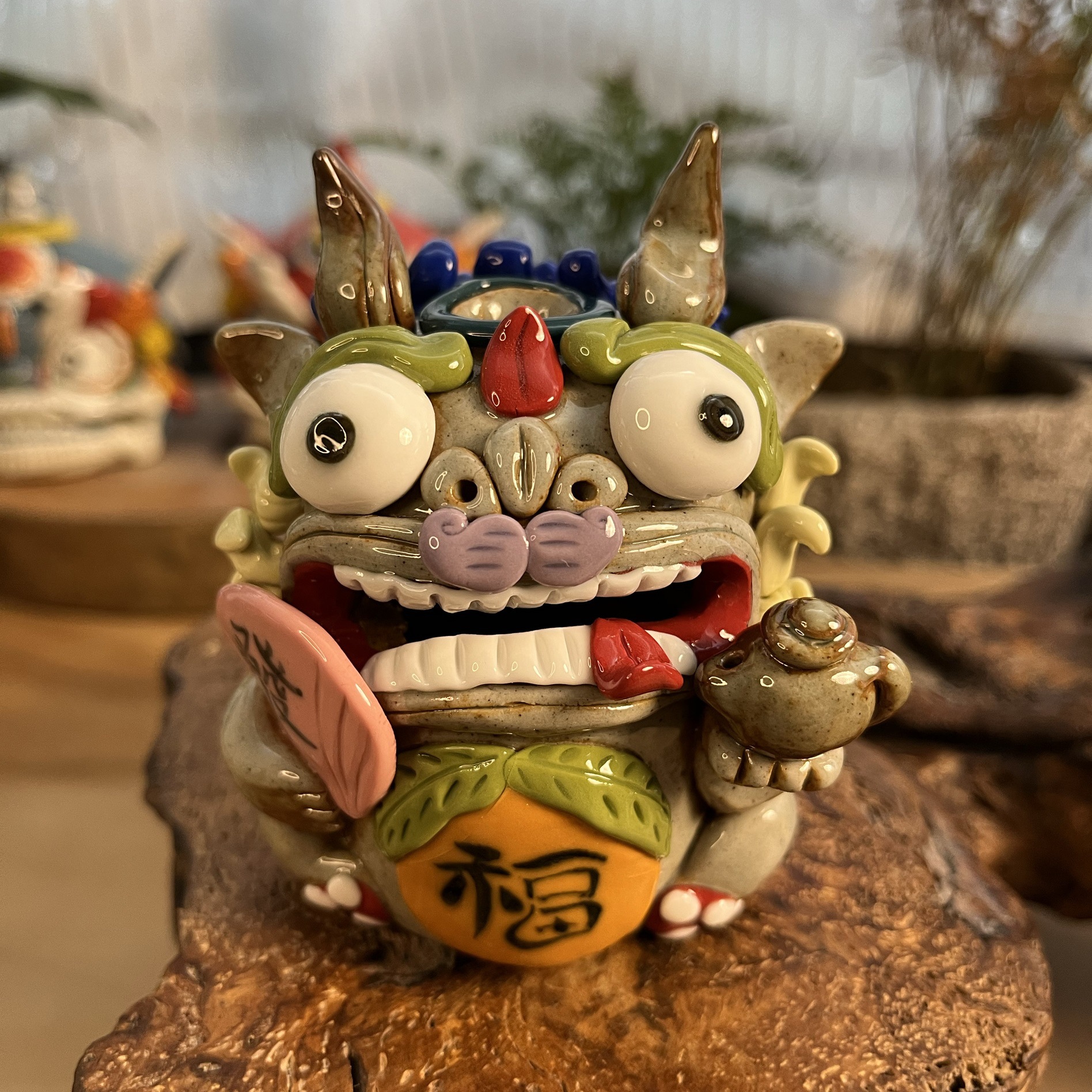 国潮紫砂茶寵置物招財可養瑞獣鎮宅描金獅子陶磁器舞獅子国風装飾品