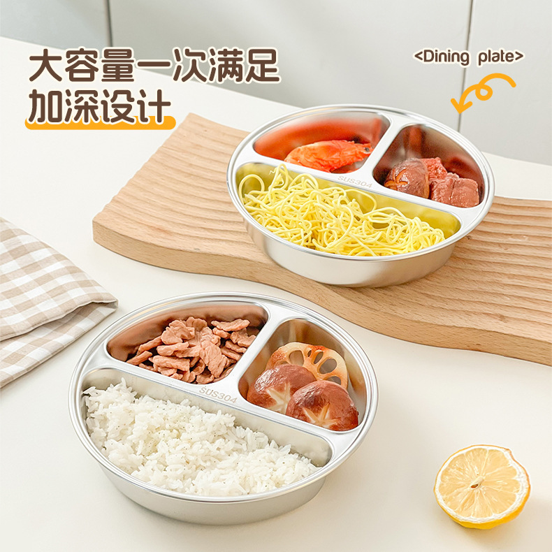 temu クロスボーダー直販 304 ステンレス鋼ラウンド 3 コンパートメントプレート深めの学生給餌プレート子供用ディナープレート定量プレート