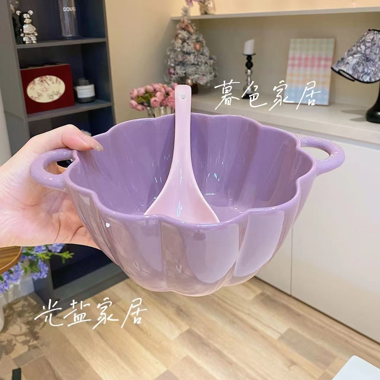 クリーム双耳セラミックカボチャボウルスープボウル大容量下絵色食器高価値丼カタツムリヌードルボウルヌードルボウル