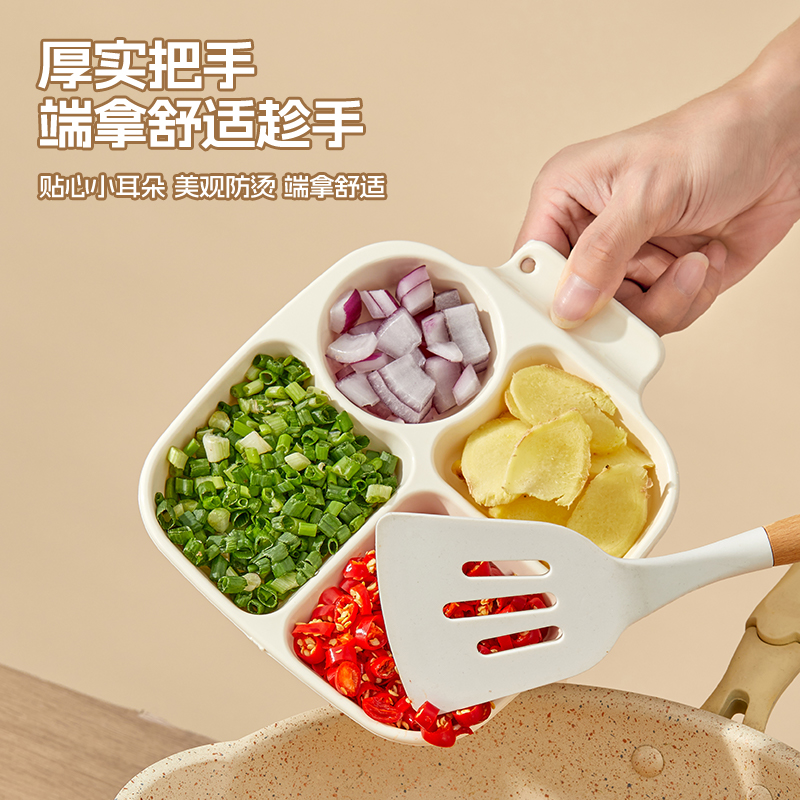 4分割おかず皿、玉ねぎ、生姜、ニンニク、おかず皿、鍋味皿、キッチン収納、調理小物、多目的おかず皿