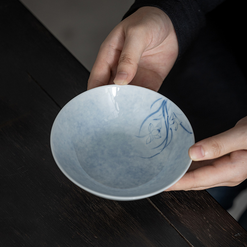 重山集甘白手描き蘭心花口壺承釉下彩蘭茶托碗托茶室茶空間果皿