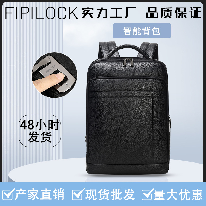 本革スマート防犯リュックメンズビジネスレジャー旅行リュックサックパソコン鞄日韓指紋ロックカバン男