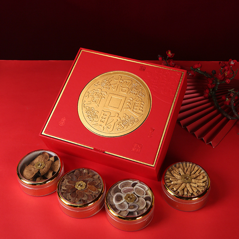富と宝の四宝包装箱 空箱 松茸、赤キノコ、アミガサタケ、デンドロビウム乾物、万能4枚組ギフト箱