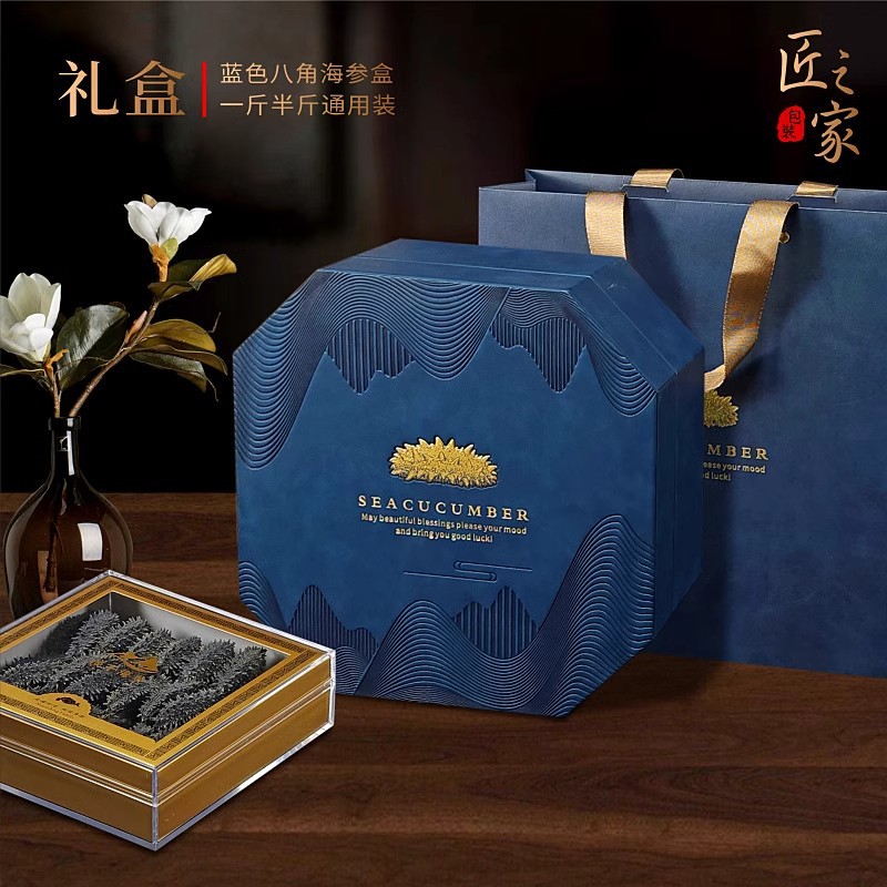 カスタマイズされたナマコ包装箱、高級レザーボックス、青い八角形ギフトボックス、0.5kg パックの海産物乾物ギフトボックス、空箱