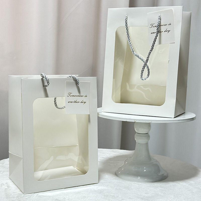 透明なショーウインドーの袋の新鮮な花束のプレゼントの袋は窓を開けて手提げ袋を開けます。