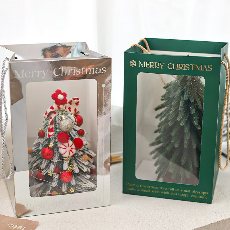 小さいサイズのクリスマスツリーの手提げ袋のクリスマスの贈り物の袋は窓を開けます。