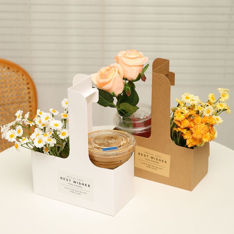 【包郵便】手提げ花箱ミルクティーコーヒーバッグ生花の外にクラフト紙の高級花芸包装の四角いプレゼントがあります。