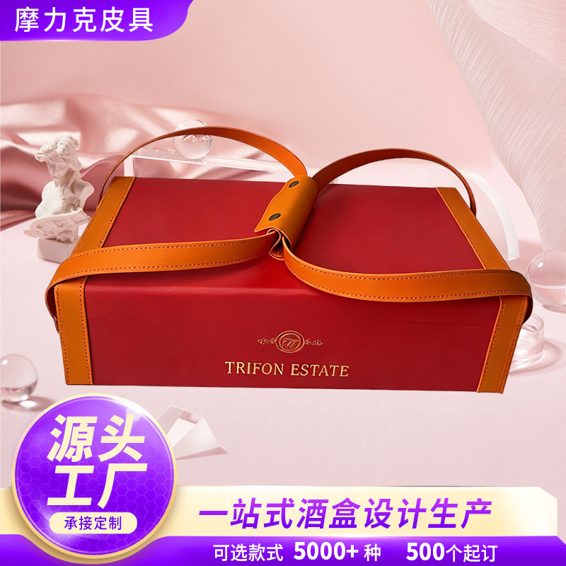 ハイエンドのカスタマイズされた赤ワインギフトボックスレザーメタルバックル面取りバッグレザー包装ダブルワイン包装ボックス