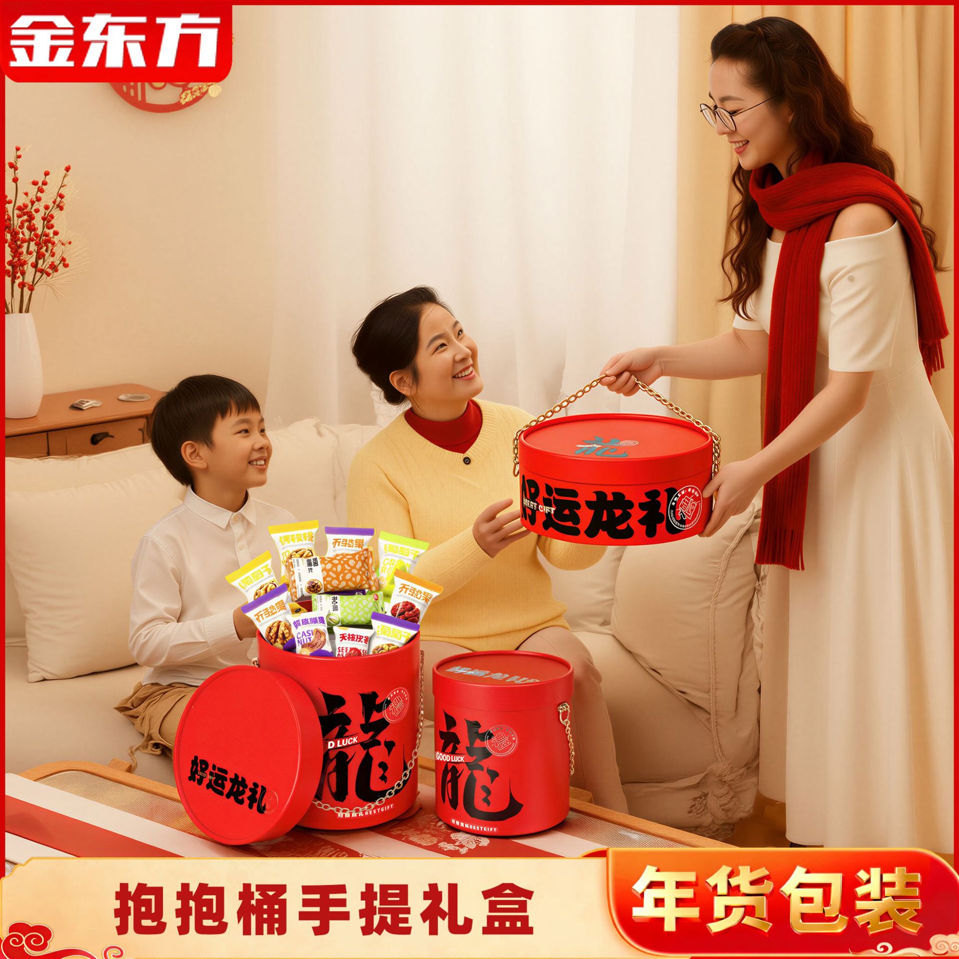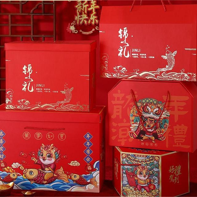 2024年新年礼箱包装龍年抱っこ桶赤高級焙煎菓子年産中国式お土産空箱