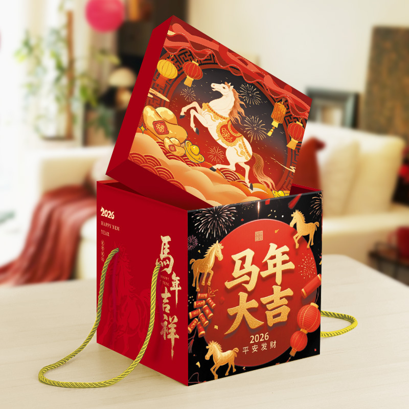 2026年新春 赤色の持ち運び可能な馬年記念品 年越しギフトボックス カスタムメイドの酒類・ナッツ・スナックギフトボックス