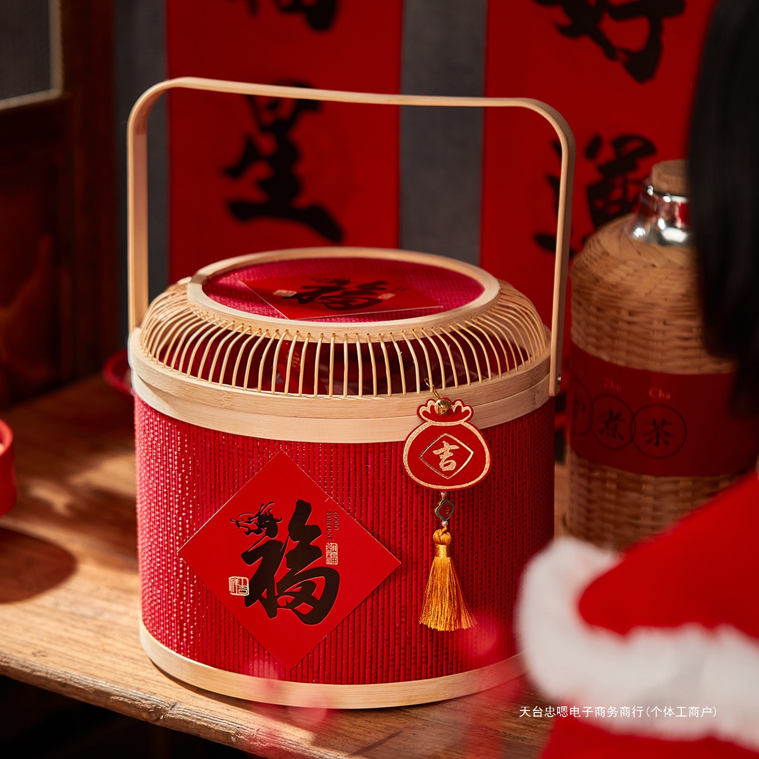 春祭りお祝い赤い新年ギフトボックス竹バスケットギフト専門二層ポータブル竹バスケット工場直販在庫あり