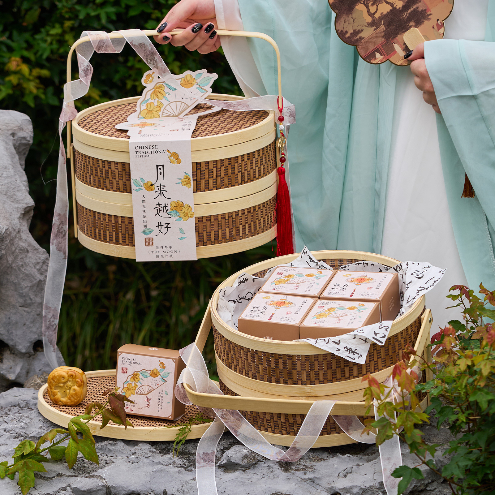 2024中秋節国風月餅包装箱二重竹編み竹かご氷皮流心ギフトボックス空箱