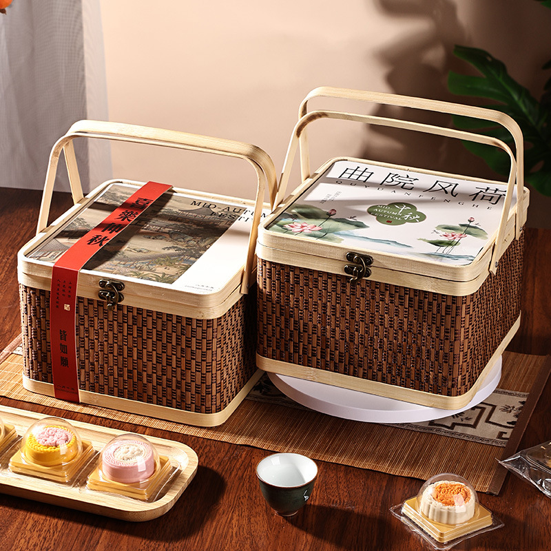 新しい中秋の月餅包装竹編み箱国潮風創意月餅8粒入り手提げ竹かご箱手作り卸売り
