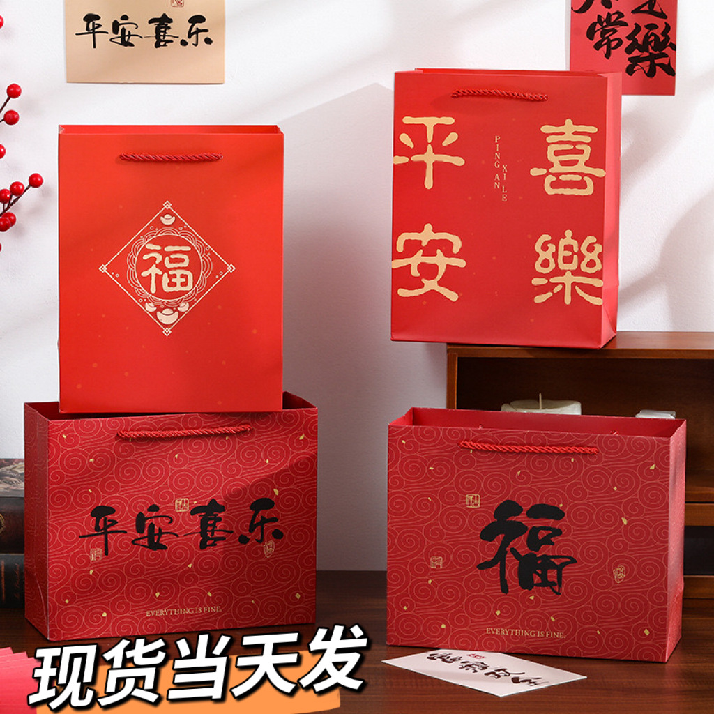 高級感のある中国風の赤いギフトバッグ、在庫あり、新年の贈り物包装紙袋、結婚式のお菓子の持ち運び袋、金箔押し