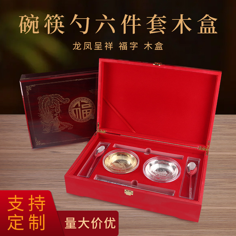 金型の銀器の碗のスプーンの箸の礼箱の結婚する高級な銀の装飾の銀器の包装箱の木の箱の竜鳳の紋様の木の箱の結婚祝い