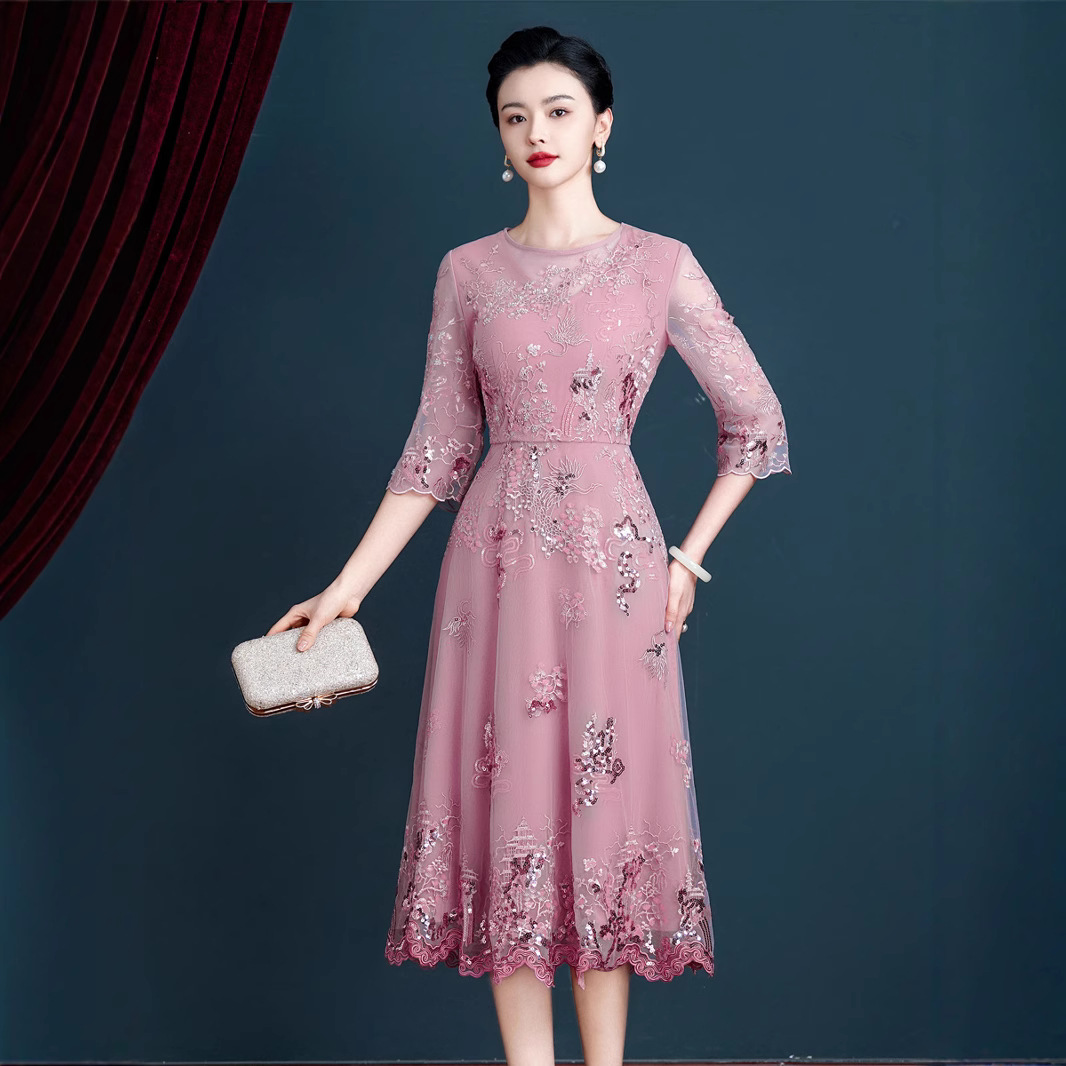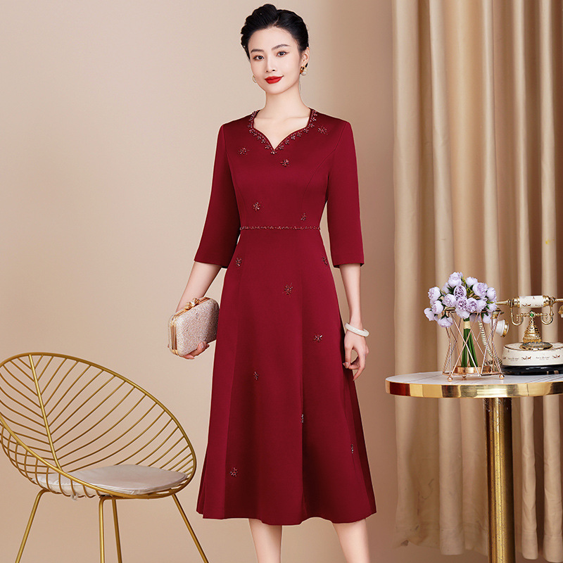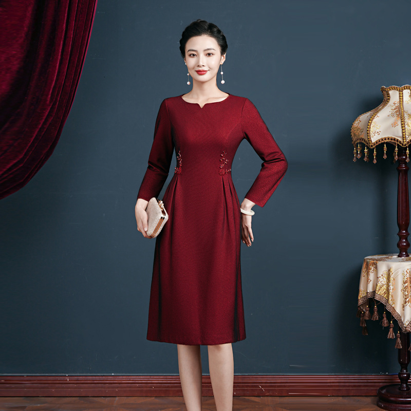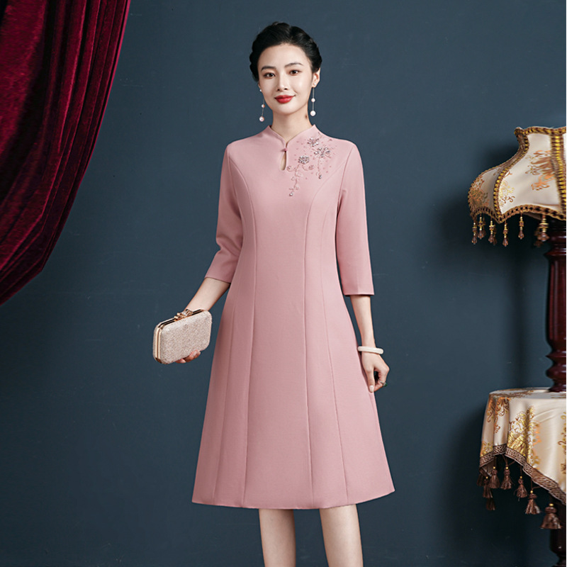 中年のお母さんの春の服のワンピース2024新型の洋気のチャイナドレスの結婚披露宴の中で年配の女性の新しい中国風のスカート