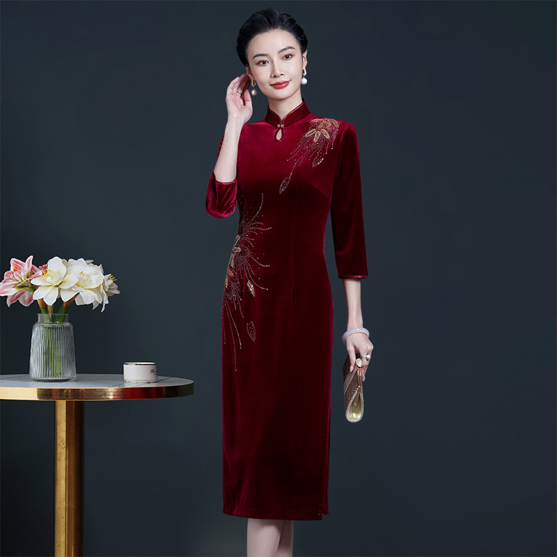 秋冬の金のベルベットのワンピースの女性の結婚式の披露宴のお母さんの服装のファッションの気質はドリルの中高年の婦人服のチャイナドレスを入れます。