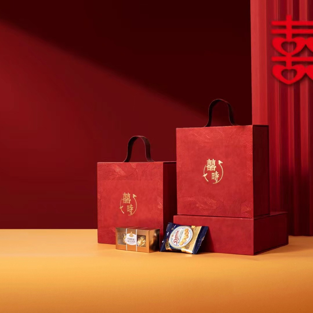 新型中国式大紅喜字喜糖礼箱天地蓋結婚式お土産喜糖箱手提げ袋付き現物