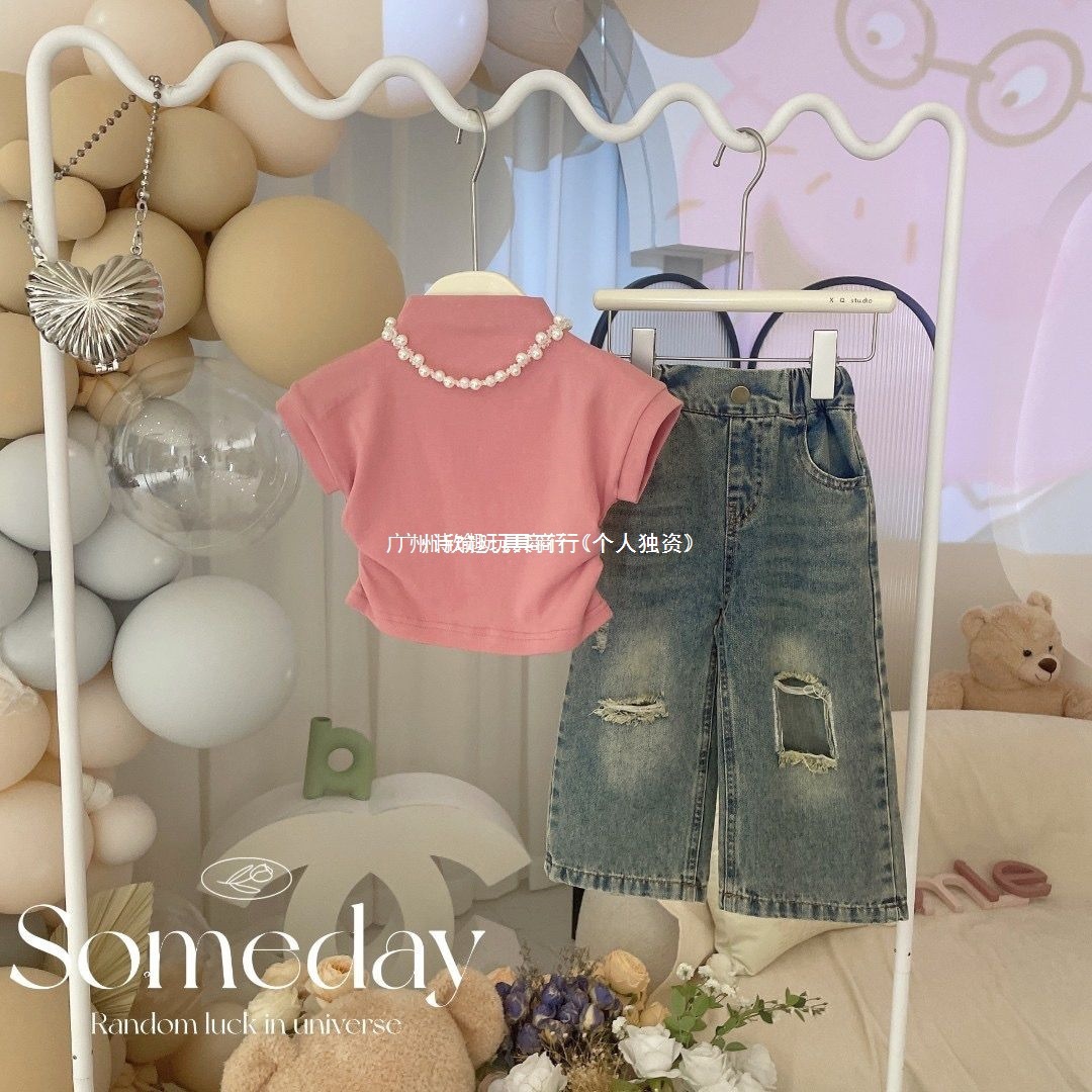 女の子サマースーツ 2023 新しいスタイルベビーガール夏半袖ジーンズツーピースセット子供の Tシャツ女性