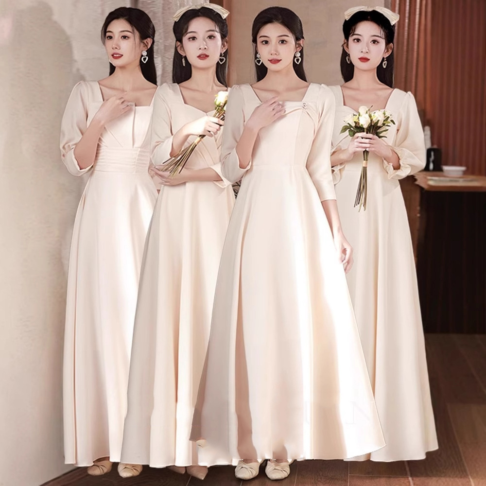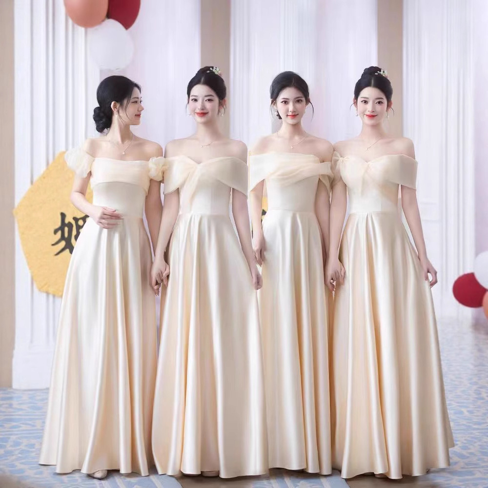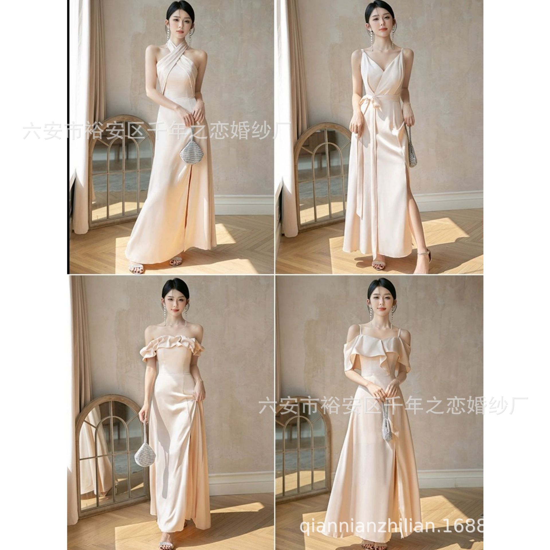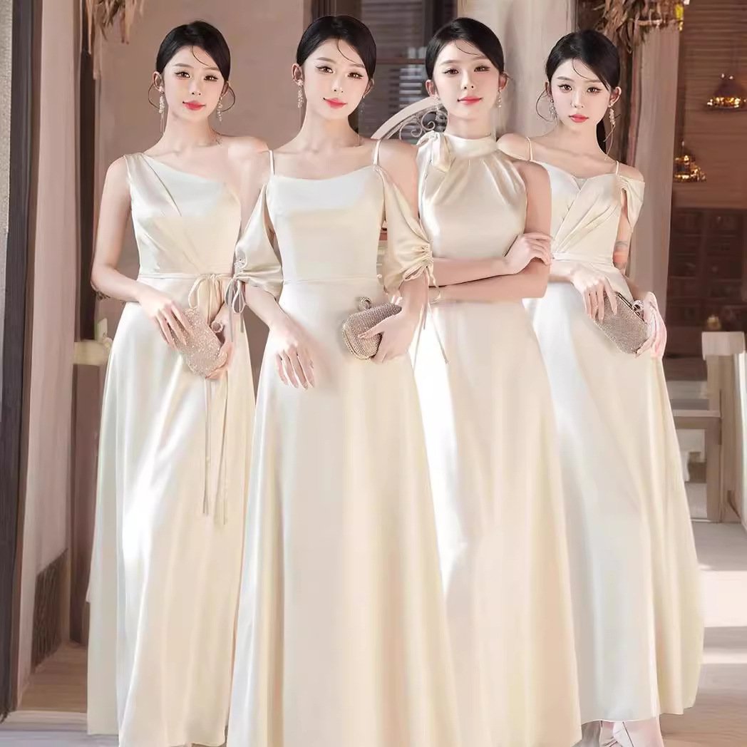 シャンパンサテンブライズメイドドレス2025新作ホストパフォーマンスドレスシスターグループ誕生日イブニングドレスドレスは通常時に着用できます