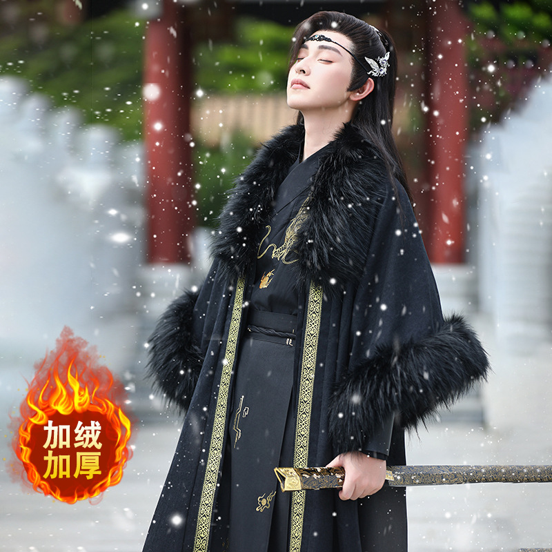 オリジナルの冬の新型のタヌキの毛の漢服の男性のベルベットの半腕のマントのマントの古風な毛の襟は取り外し可能です。
