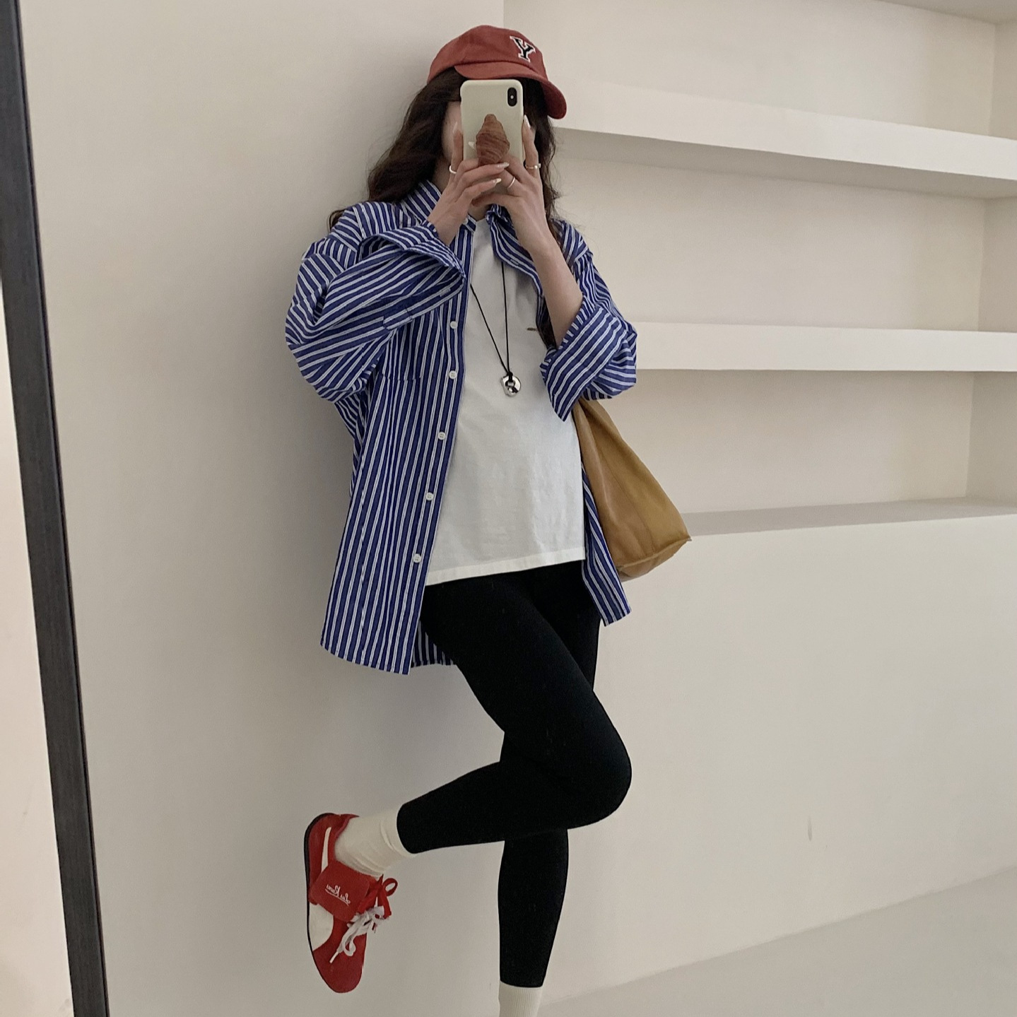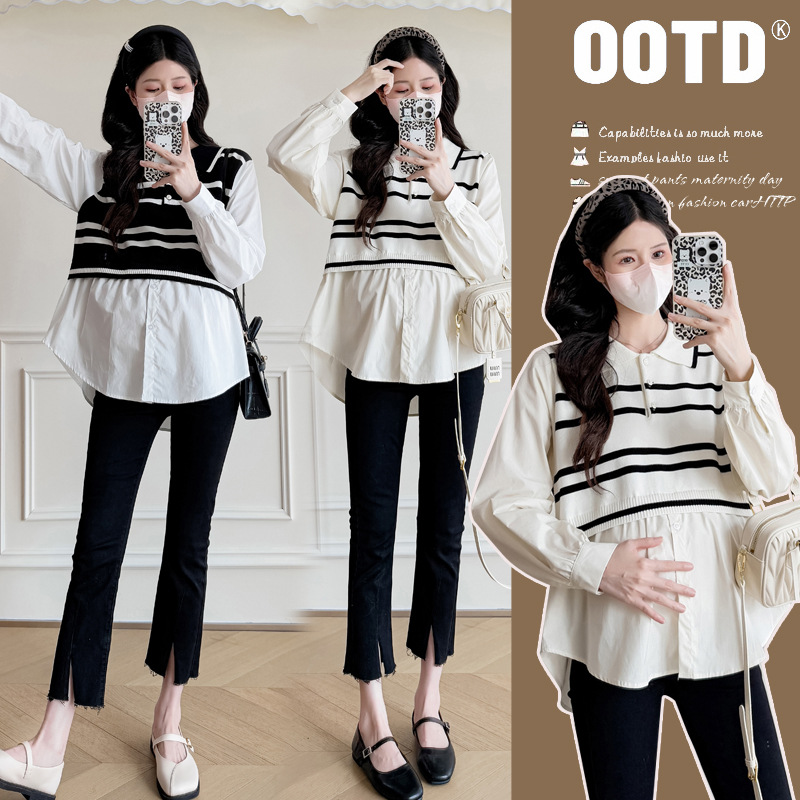 2025年春の妊婦向けトレンドママ風トップス、ストライプ柄フェイクツーピースシャツ、ゆったりお腹カバー着痩せトップス