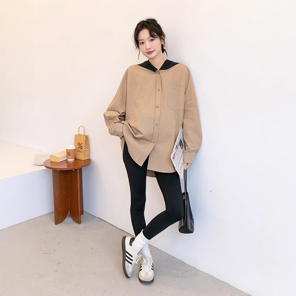 妊婦服の春のファッションの色合わせの帽子のシャツの韓国系の怠惰な風の純色の妊娠期のカジュアルな長袖の百合の上着