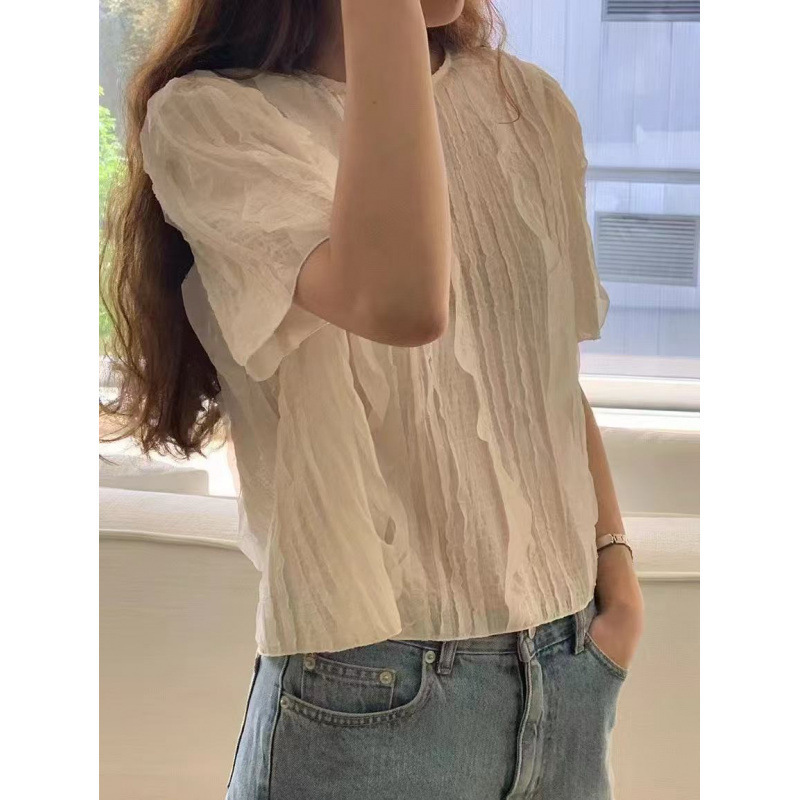 フリルパッチワークラウンドネック半袖シフォンシャツ韓国風シックなニッチデザインライトで洗練されたファッション