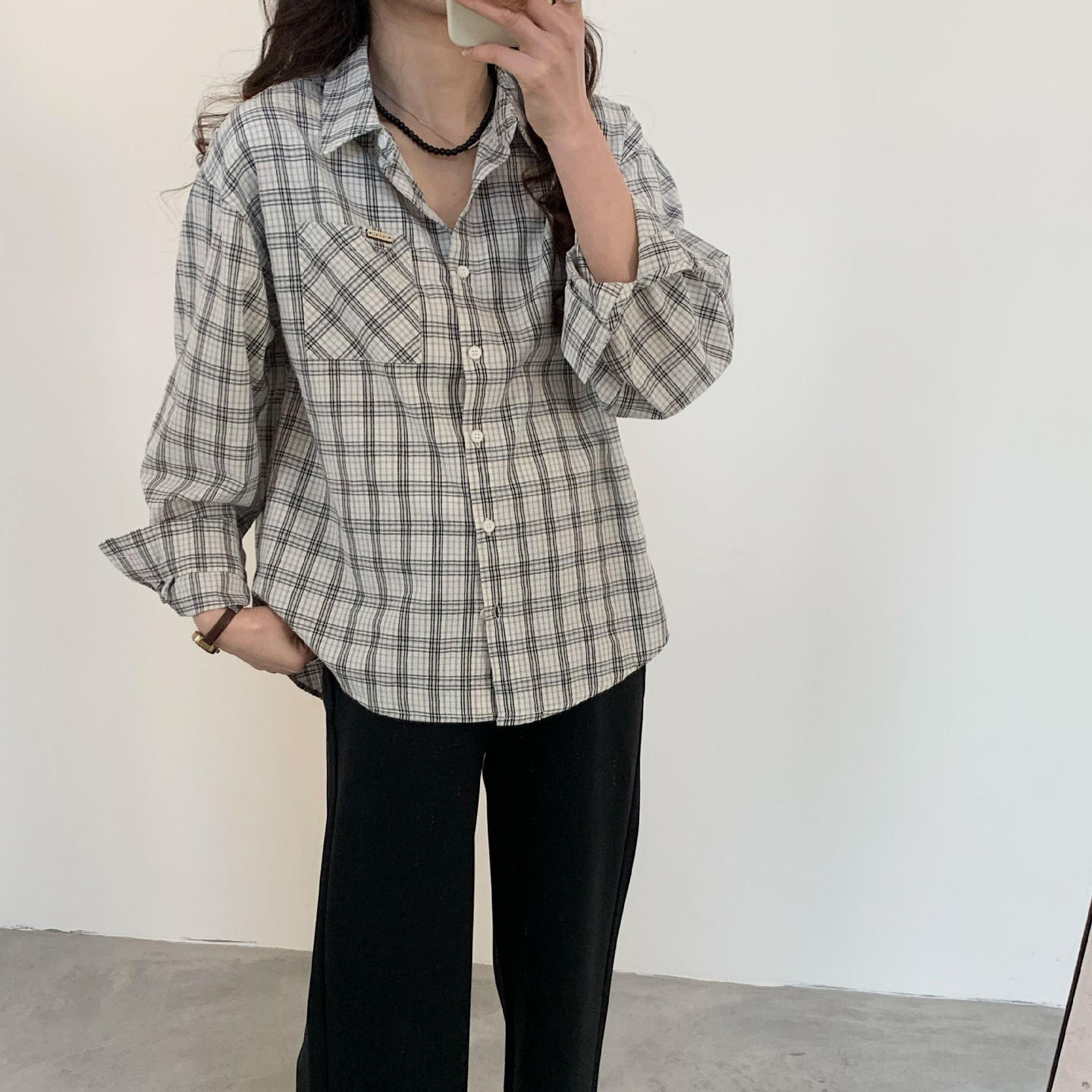 春の新型韓国風妊婦服の襟付きチェックシャツのファッションカジュアルな通気性のある長袖妊婦シャツの上に