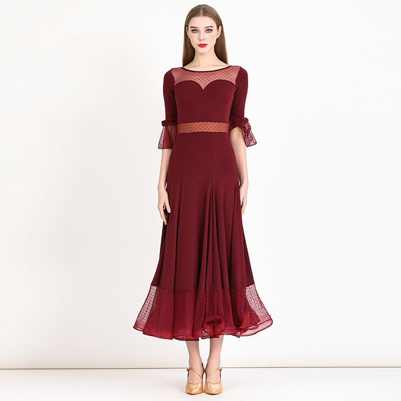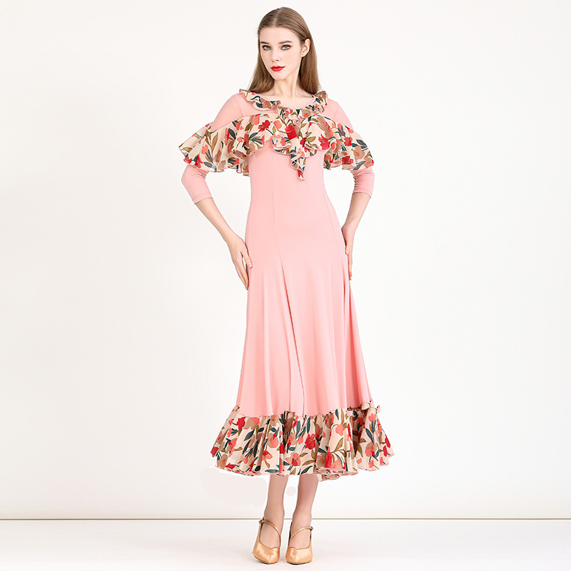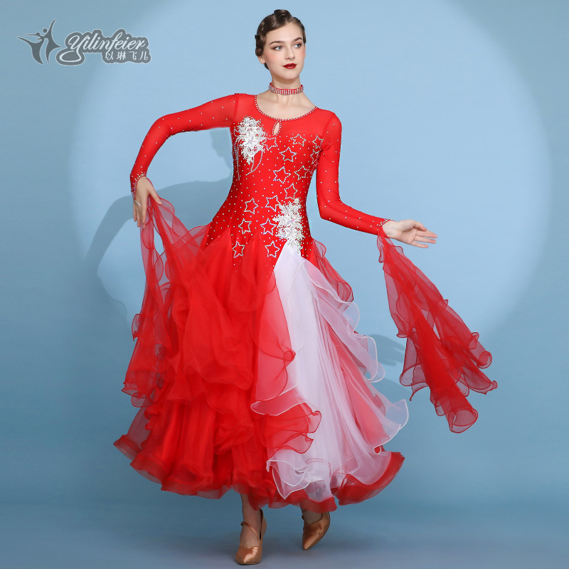 赤塵女人花丸首長袖摩登舞ワンピースs7062国標舞社交舞ワルツ演出服