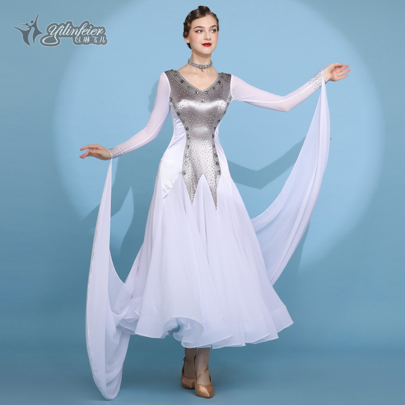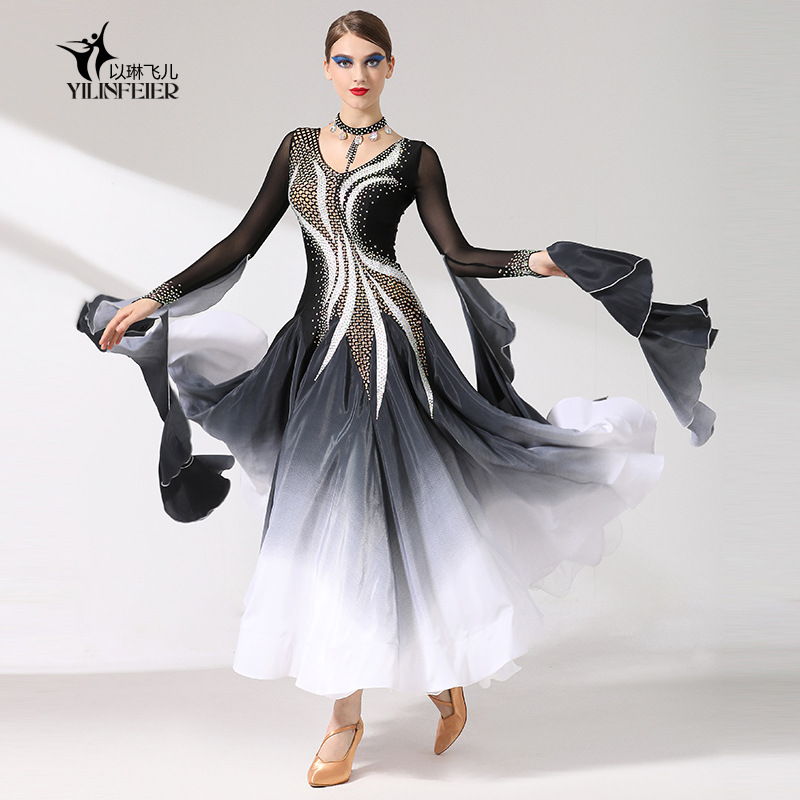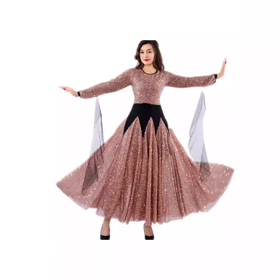 新しいモダンダンスドレス、ロングスカート、長袖パフォーマンス衣装、社交ダンス衣装、モダンダンス