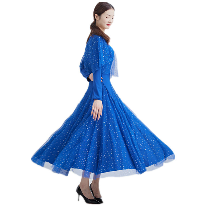 新しいモダンダンススカートドレス、大きなスイングスカート、長袖パフォーマンス衣装、社交ダンス衣装、モダンダンス