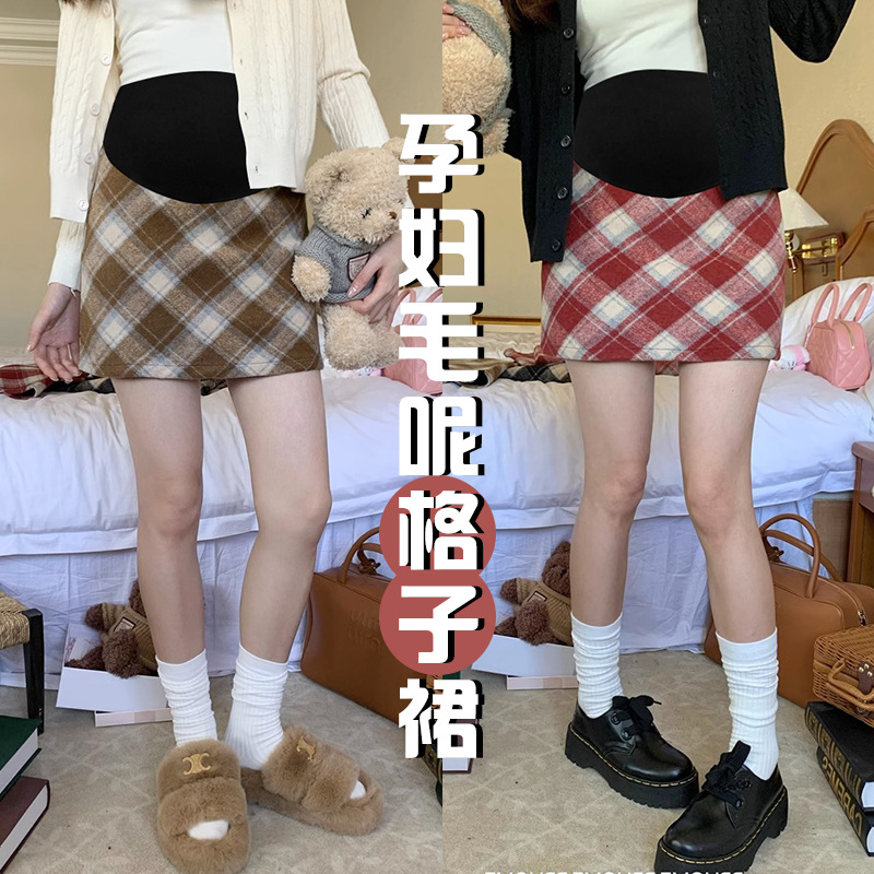 妊婦のレトロな毛の格子の半身のスカートの2023秋冬のa字の格子縞の厚い百合の腹の長いスカート
