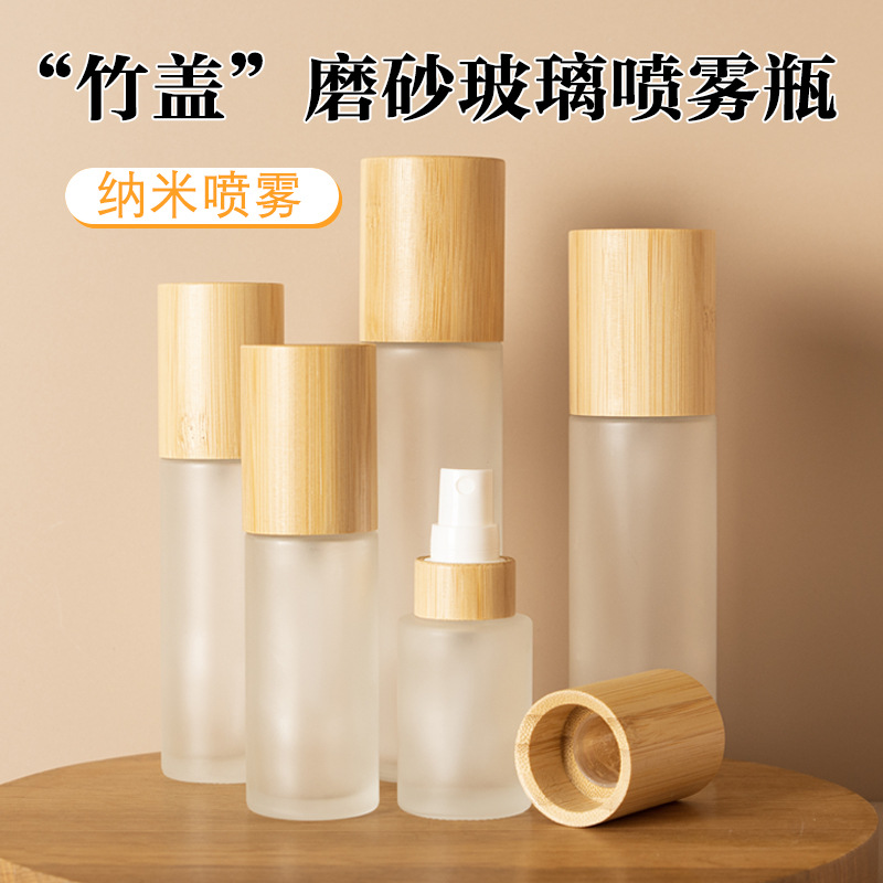 天然竹木蓋付きすりガラス遮光ボトル 化粧水・トナー・香水スプレーボトル プレス式ナノスプレー