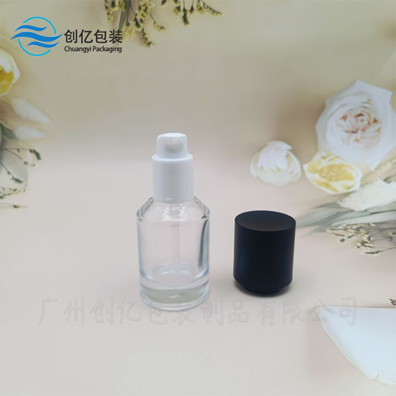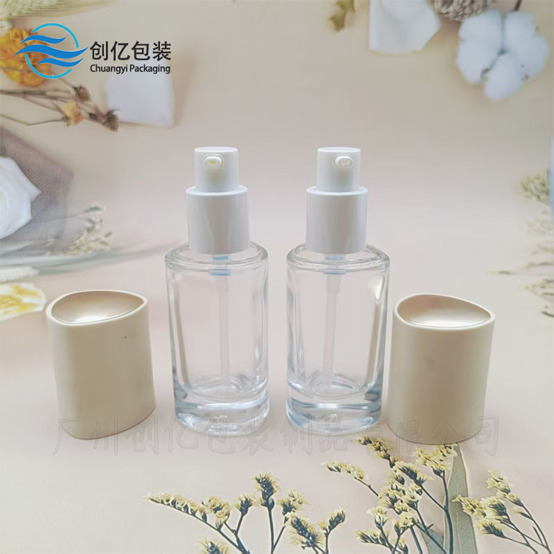 新しいストレートラウンドエッセンスガラス透明ボトルプレスポンプローションボトルファンデーションアイソレーションクリーム包装