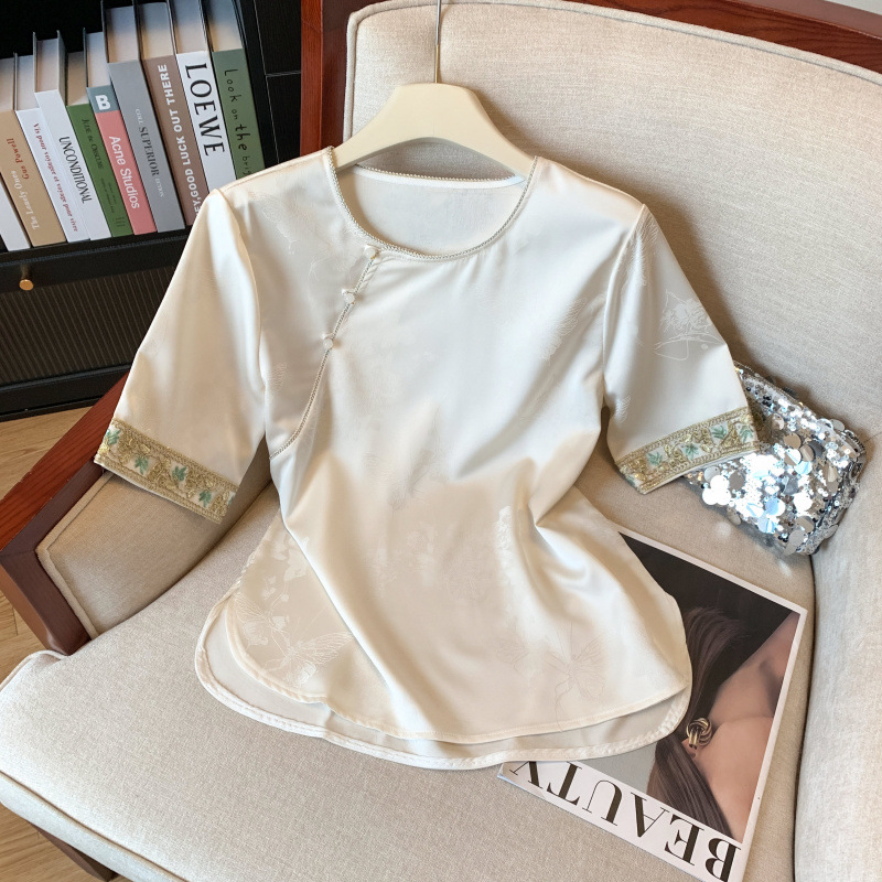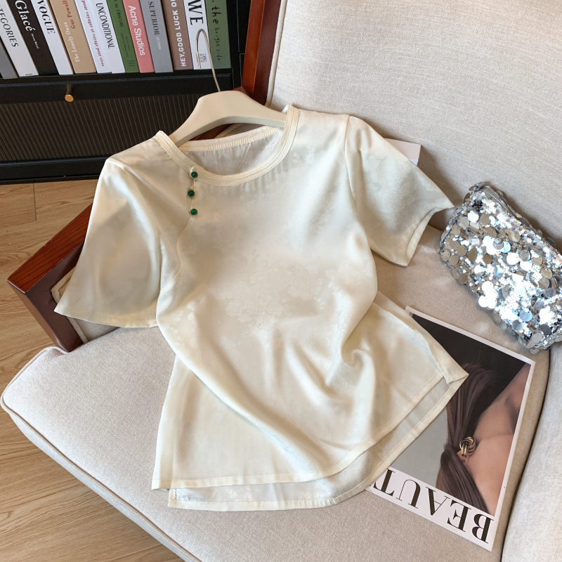 新しい中国風のシルクラウンドネックジャカードサテンシャツ女性のための 2025 夏中国風シックな桑シルク半袖トップ