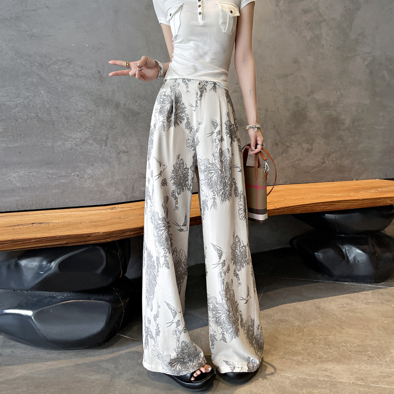 女性用のリアルショットレトロジャカードコットンとリネンのワイドレッグパンツ、フレンチスタイルのレイジーでリラックスしたルーズストレートレッグカジュアルリネンパンツ