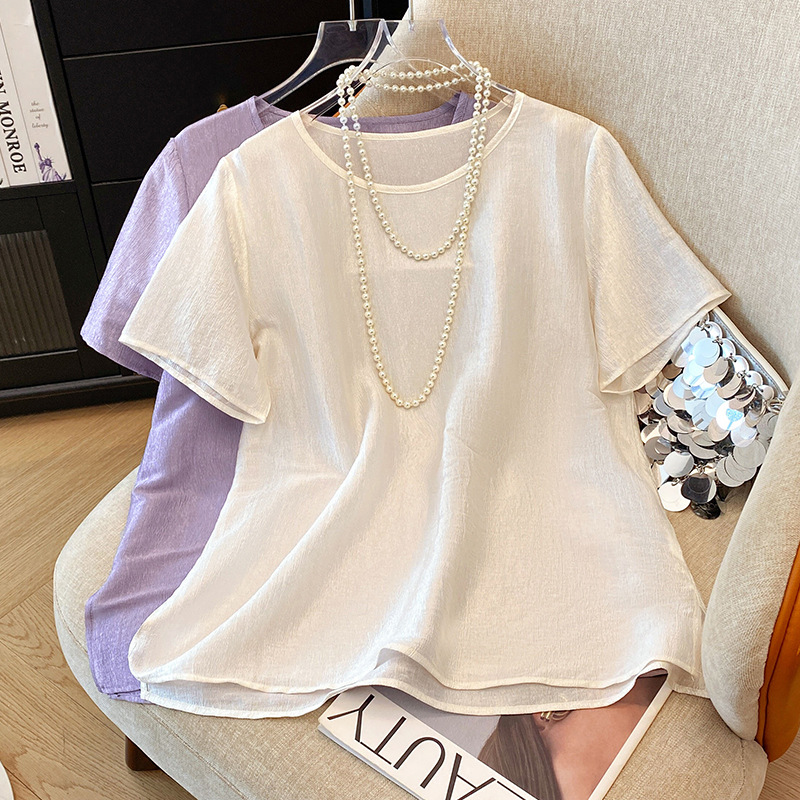 新しい中国風のレトロなラウンドネックのわずかに透けるTシャツテンセル多用途痩身長袖トップ女性の新しいTシャツのリアルショット