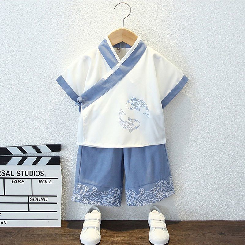 夏半袖薄い中国風ベビー漢服スーツ男性と女性のための古代中国風妖精エレガントな子供用 2 点セット