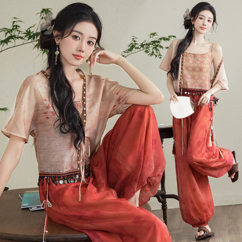 2024新中国式国風プリントストラップ付き半袖カーディガン外にストラップ国潮復古灯籠ズボン三点セット
