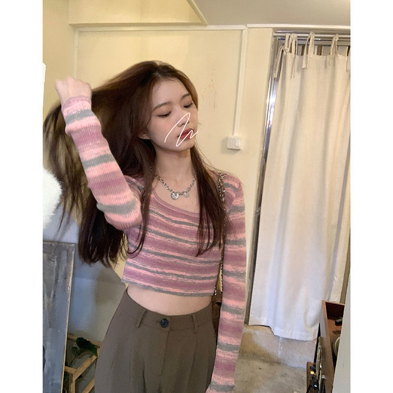 ホットガール BM スタイルラバーパウダーストライプ長袖 Tシャツ女性のための春の新しい韓国スタイル痩身ショートクロップトップ
