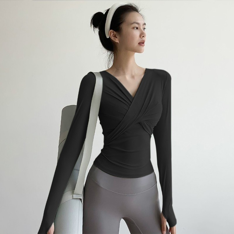 ドショップ品質モーデール260グラムスポーツスリムスリムvネック長袖tシャツ女性通気性フィットネス上着